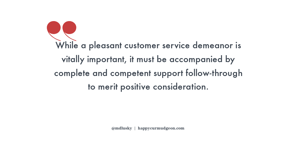 While a pleasant customer service demeanor is vitally important, it must be accompanied by complete and competent support follow-through to merit positive consideration. Otherwise, it winds up feeling like a clear case of over-promising and under-delivering.
