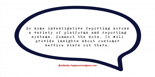 Do some investigative reporting across a variety of platforms and reporting systems. Connect the dots. It will provide insights about customer service stars out there.